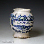 A rare small scale Apothecary Drug Jar for Laudinum ( tincture of opium) . Decorated in blue and white with the legend in Latin "P.LAVDANVM" , the cartouche surrounded by two birds, a basket of fruit, flowers and an angels head with tassle.
