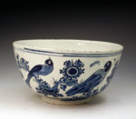 Antique Dutch delftware tin glaze bowl strongly decorated in cobalt blue with figures of birds and foliage.