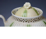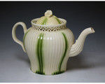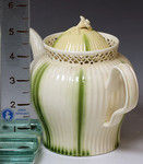 A fine lead glazed creamware teapot with green glazed stripes. The teapot is hand thrown with a fine reticlated border. The lid is domed shaped and surmounted with a flower finial. The spout is moulded with a pattern in relief.