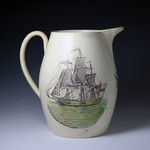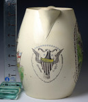 Right side of the pitcher with an American Merchant Ship flying an American Flag with 15 stars. The transfer below the spout is a spread-winged Heraldic Shield American Eagle, with ribbon in beak with "E. PLURIBUS UNUM" and clutching an olive branch and arrows in talons, with surrounding inscription, "Peace, Commerce and Honest Friendship with all Nations. Entangling Alliances with none - Jefferson .