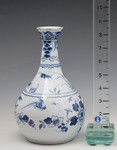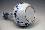 Antique English delftware pottery bottle painted with Chine motifs of flowers, foliage and a bird chasing an insect. Mid 18th century.