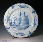 A rare and highly decorative English delftware dish made in the mid 18th century attributed to Bristol or Liverpool delftworks. The dish has a border decorated with four fish, the central panel shows a ship at sail with a Chinese figure under a parasol at the tiller.