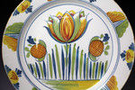 Antique period delftware pottery charger well decorated with a tulip in polychrome colours.