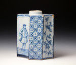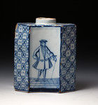 This exceptional caddy is delicately and finely decorated in blue and white with stunning images of a gentleman and his wife in European attire who are individually represented on seperate panels.