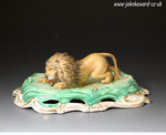 A well modelled and rare porcelain figure of a crouching lion modelled on an a green and gilt oval base.