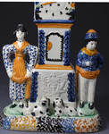 The long case clock, is flanked by a male and female figure.