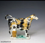 Early 19th century pearlware sponge decoarted cow creamer with milkmaid at work.