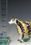 The fat bodied cow is standing on a thin and charmingly decorated soft green coloured base.