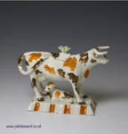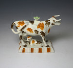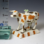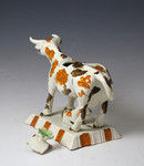 Antique English pottery cow creamer modeled standing on an oblong canted base with a figure of a calf resting.