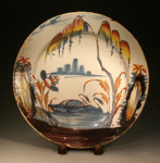 ANTIQUE ENGLISH POTTERY DELFTWARE DISH WITH SWANS ON LAKE C1750