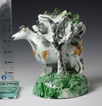 A very fine English pottery figure group in the form of a cow creamer. This figure is a rare form with a calf lying down on the base and a wonderful bocage feature as a decorative backdrop to the scene. The figure is exceptionally well modeled with strong relief decoration and fine underglaze colours denoting an early date in the making.