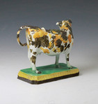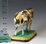 A fine and rare Prattware coloured pottery figure of a cow in the form of a creamer modelled standing on a decoartive oblong base with a sublime glaze. One of the best examples of its type probably made in Yorkshire England and dates to the 1800 period.
