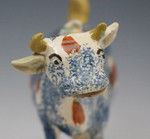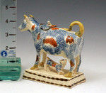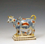 A very charming English pottery pearlware cow creamer standing on a base with blue sponge and mustard spot decoration. The calf is unusually modeled and I cannot recollect ever having seen one actually suckling. The creamer is slightly smaller than usual and the overall rendition is naive and warming, a most endearing and rare piece complete with original lid.