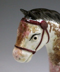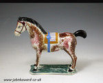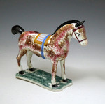 The horse is sponge decorated in shades of maroon and brown a pleasing effect with the mustard , maroon and blue striped saddle with its blue strap. The figure of the horse is charmingly rendered with warming appeal. Made by the St. Anthony's Pottery located in Newcastle Upon Tyne North East England.