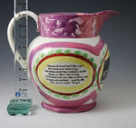 A large sized pink luster pottery jug with poem, view of the Wear Bridge and a rare image of a handsome couple with the motto "There's the girl that I love dearly".