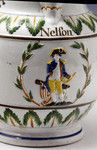 The relief moulded cartouches of Nelson, a man of war under sale, Britannia with lion flanked by a hussar and foot soldier are spectacular with crisp and good detail. There is extra detail at the top border of military insignia of trophies of war with flags, drums, spears sabres and cannon. The underglaze colour application of pratt colours is exceptional.