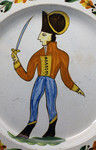 Antique period pottery plate depicting a figure of a military man brandishing a Sabre all strikingly and naively painted in pratt colours.This plate is true piece of folk art from the late 18th century.