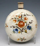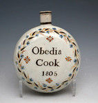 English pearlware glaze pottery Spirit flask of circular form decorated under-glaze in Pratt colours. One side named and dated Obedia Cook 1805 in a floral border, the reverse painted with flowers and leaves. A historical piece of social interest with a story to tell.
