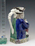 A very clean and vibrantly decorated Toby jug. The figure is holding a cup and pitcher and modelled seated on a sponge decorated base, the interesting handle is in the form of a caryatid .