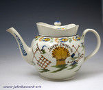 A fine good sized punch pot profusely decorated in underglaze prattware colours of farming implements and sheaves of wheat or corn and named James Thomson in capital letters.