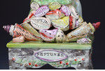 The figure of Neptune is well modelled with good movement, he is a holding a trident and is flanked by a wonderful figure of a dolphin. The tablebase is associated exclusively to Sherratt.The figure is titled on the base NEPTUNE within a cartouche decorated with a pink luster border, a most unusual and rare detail for Sherratt.A strong and decorative feature of this figure is the assemblage of shells under Neptunes feet, the quality of modelling and strong vibrant decoration is a delight.