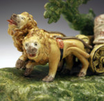 Antique English Staffordshire pottery figure group of the earth goddess Cybele in her chariot which is drawn by a pair of Lions.