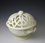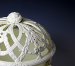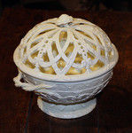 Creamware pottery orange basket and cover impressed under base "wedgwood". This lower case mark dates the piece to c1775/85. The base is elaborately decorated with relief molded acanthus leaves and a scrolling ornate strap work design. The open trellis cover replicates this deign and features a flower head finial.