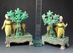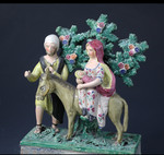 A rare pair of table base pearlware figures depicting the Flight and Return from and to Egypt. Table bases figures are attributed to Obadiah Sherratt pottery Staffordshire.