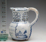 A good English delftware pottery puzzle jug decorated in cobalt blue with chinoserie images.