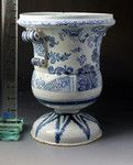A fine antique delftware pottery flower urn decorated in blue and white with flowers and foliage.