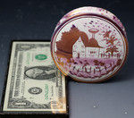 The cover is hand decorated in pink luster with a house and tress whilst the base is finished in a dappled splash lustre.