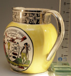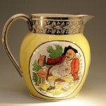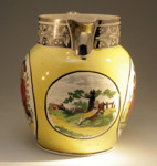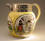 Antique canay yellow ground pitcher with undergalze transfer prints of Toby Philpot,the farmers Arms and a boy in a rural landscape which are over decorated in enamels. The rim of the jug is enhanced with fine silver lustre resist decoration.