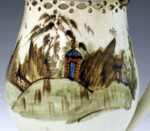 Antique pottery pearlware puzzle jug decorated naiveley by hand in Pratt colours of buildings in a rural setting. The style of decoration of this puzzle jug is similar to that found on pieces of hand painted blue in the chinoserie fashion also produced by the English potters.