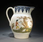 Antique Staffordshire or Yorkshire pottery pitcher decorated in the clasic "Pratt" palette. The jug is relief moulded with rural sporting scenes of men hunting for game. The pitcher was made in circa 1795. A similar jug can be seen in the Victoria and Albert Museum in London.