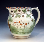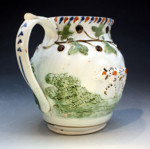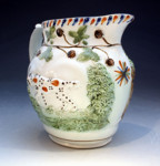 Antique Prattware pottery pitcher relief moulded with sporting dogs in a rural setting. The border decorated with blackberries and leaves. Attributed to Staffordshire or Glamorgan pottery Swansea Wales circa 1800 period.