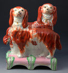 Antique Staffordshire figures of spaniels standing on pink and green bases known as Grace and Majesty c1855