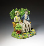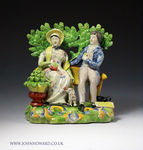 Staffordshire pottery pearlware pottery figure group named Persuasion made by the Patriot Group. This quality and decorative figure group is a rare titled version with the incorrect spelling PERSWAITION featured on a tablet by the male figures foot. Unusually the scrolls on the base are painted in blue and yellow a departure from the red white and blue usually associated with this group.The bocage is "pine cone".