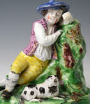 Staffordshire pottery pearlware figure of a slumbering shepherd boy with his trusty dog.
