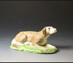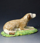A rare Staffordshire pottery figure of a setter resting on a green base.