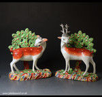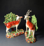 A rare and very decorative pair of standing pearlware pottery figures of doe and stag.
