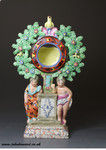 The attention to detail is excellent and the coloured applied enamels are of the highest quality.The watch holder is flanked by figures of children and amusingly a figurea of three yellow birds are shown perched in the bocage of the tree.