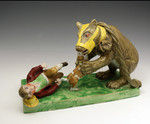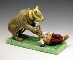 The figure is vibrantly modelled with the standing mussled bear tussling with the snarling dog and the excited keeper loosing balance lying prostrate on the floor.