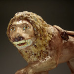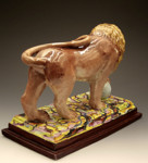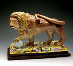 This lion on a base is modelled from the Medici Lions which are two lion sculptures placed around 1600 at the Villa Medici, Rome, Italy, and since 1789 displayed at the Loggia dei Lanzi, Florence. The sculptures depict standing male lions with a sphere under one claw, looking to the side. The Medici lions have also been copied, or strongly inspired new sculptures, and this pottery figure from circa 1810 is such a piece.