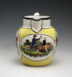 A fine quality and rare pearlware jug well decorated with two panels depicting a "Cock Fighting Scene". The panel below the spout shows a drinking and smoking scene typical of the period.