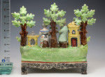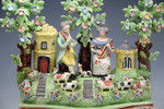 A rare and complex Staffordshire pearlware pottery tablebase group with bocage in the "Sherratt" manner. A large flock of sheep are under the watch of a dog and a couple of male and female shepherds who are to passing time and soothing the flock playing musical instruments. The large group shows the pair sitting against a castle with three bocage trees against the skyline. The scale of the castle buildings add a touch of whimsical fantasy to this very charming figure.