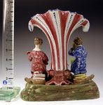 A large trumpet shaped spill vase with figures of musical shepherds attending their flock whilst playing on the banks of a stream flanked by two conche shells.