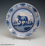 Blue and white delftware plate with image of a ewe in landscape c1725