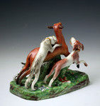 A very rare Staffordshire pottery pearlware figure of a deer hunted by three dogs.
