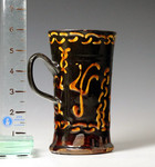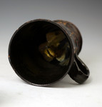 Very rare earthenware tankard decorated with stylised tulips and initialled "WS" in a yellow slip applied to a dark treacly coloured manganese ground. The unglazed base of the tankard is a dark red colour. Interestingly the inside of the tankard sports a rather chubby frog with a yellow glaze with touches of brown slip.