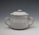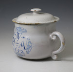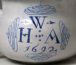 A rare dated two handled cup and cover in delftware with the initials W.H.A and dated 1692 within a cartouche of four script like scrolls and still retaining the original cover. Probably Southark or Pickle Herring delftworks.